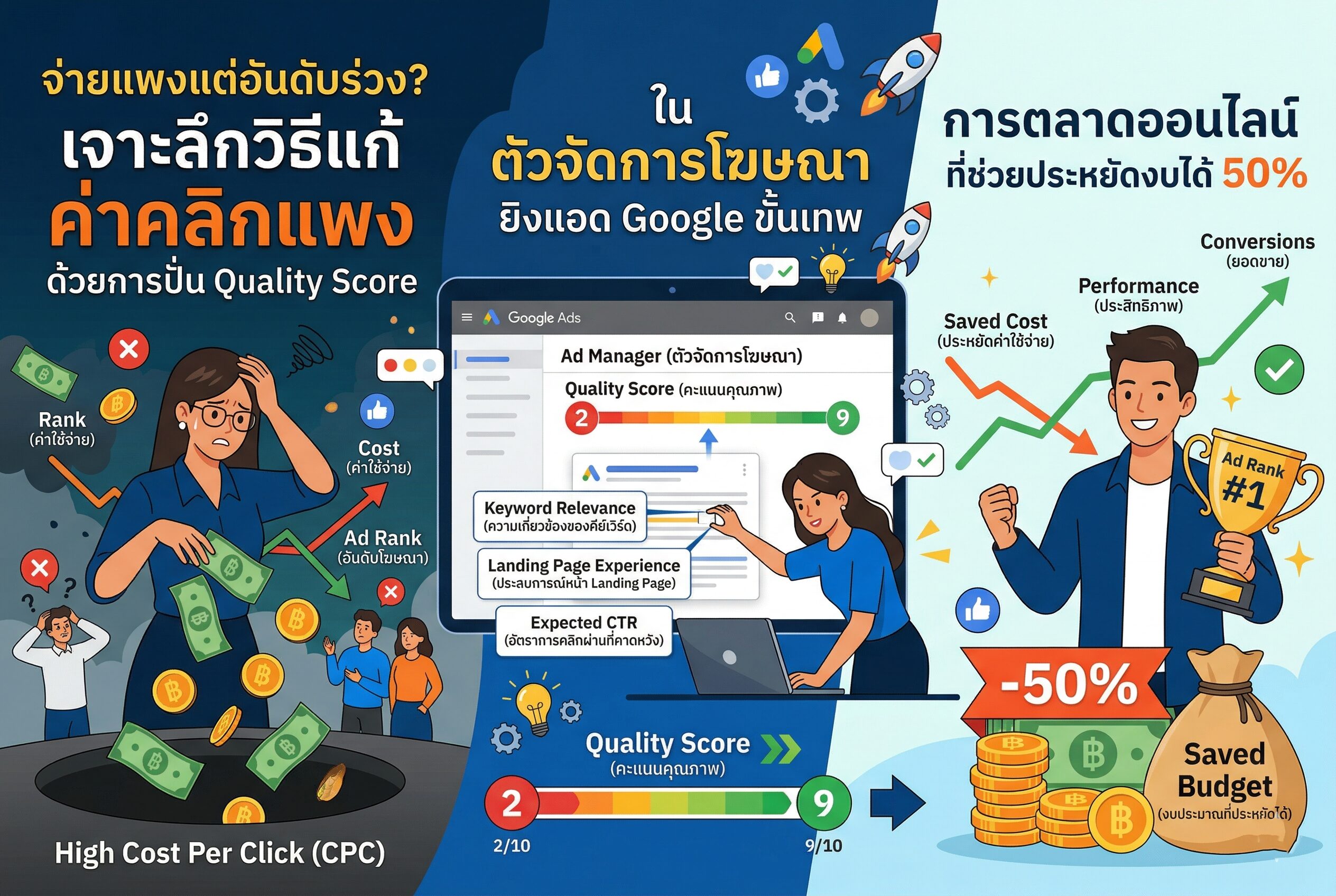 ผู้ชนะและได้อันดับ 1 คือ แบรนด์งบน้อยแต่เป๊ะ ครับ! คุณเห็นพลังของ ตัวจัดการโฆษณา ฝั่งกูเกิลหรือยังครับ? การดัน Quality Score จาก 2 ไปเป็น 10 คือการเสกส่วนลด ค่าคลิกแพง ให้ถูกลงถึง 5 เท่า โดยไม่ต้องไปนั่งต่อราคากับใครเลย!