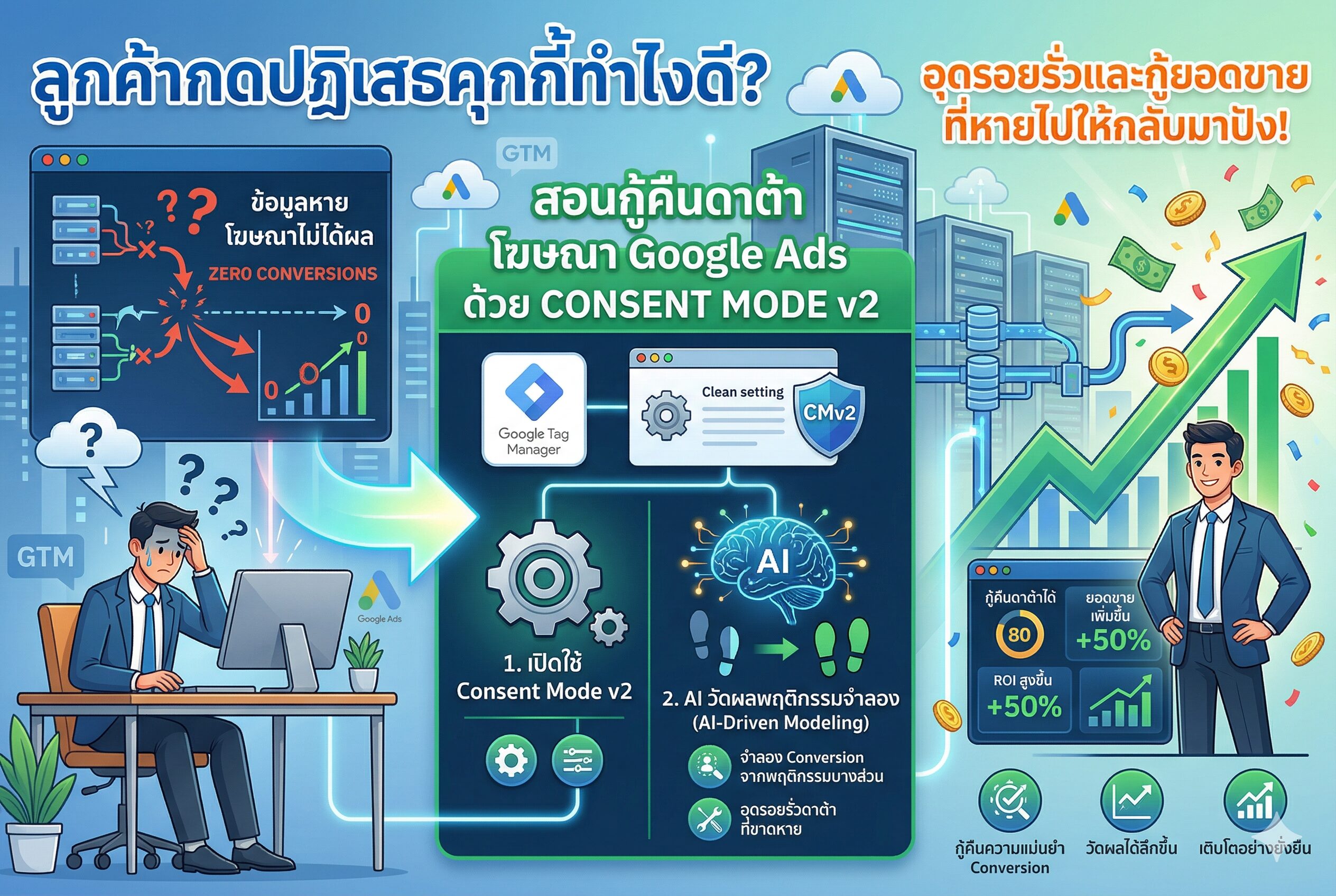 ก่อนที่เราจะไปกู้คืนข้อมูล เราต้องเข้าใจสถานการณ์ที่เลวร้ายที่สุดก่อนครับ เมื่อลูกค้าเข้ามาที่หน้าเว็บและกด “Reject Cookies (ปฏิเสธคุกกี้)” โค้ดของ Google Tag Manager (GTM) จะสั่งระงับการทำงานของ ad_storage (คุกกี้โฆษณา) และ analytics_storage (คุกกี้วิเคราะห์ผล) ทันที! ผลที่ตามมาคือ 1. ลบล้างตัวตน (No Identity): ระบบจะไม่สามารถจดจำได้ว่าลูกค้าคนนี้คือใคร ไม่สามารถตามไปทำ Retargeting ได้ 2. ลบล้างยอดขาย (Lost Conversions): ถ้ายูสเซอร์คนนี้โอนเงิน 10,000 บาท ข้อมูลนี้จะไม่ถูกส่งกลับไปที่หน้า Dashboard ของ Google Ads เลย! ถ้าธุรกิจของคุณมีลูกค้าระดับ 40-50% ที่กดปฏิเสธคุกกี้ นั่นแปลว่า โฆษณา Google Ads ของคุณกำลังทำงานแบบ “ตาบอด” ไปเกือบครึ่งครับ! AI ของกูเกิลจะเข้าใจผิดว่า “แคมเปญนี้ยิงไปแล้วไม่ได้ยอดขายเลย งั้นฉันลดการนำส่งโฆษณานี้ดีกว่า” สุดท้าย แคมเปญที่เคยทำกำไรให้คุณ ก็จะพังทลายลงอย่างไม่เป็นท่า!2. Google Consent Mode v2 คืออะไร? มันไม่ใช่แค่ป้ายแบนเนอร์!