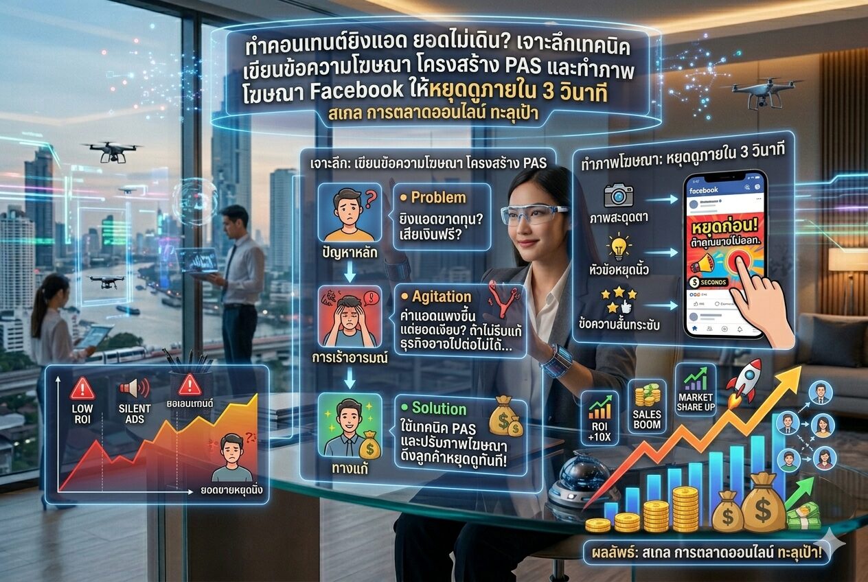 ดังนั้น หน้าที่ของ “รูปภาพ (Visual)” คือการ “กระชากความสนใจ (Hook)” และหน้าที่ของ “ข้อความ (Copywriting)” คือการ “ปิดการขาย (Close)” สองสิ่งนี้ต้องทำงานสอดประสานกันอย่างสมบูรณ์แบบ แอดของคุณถึงจะปังทะลุเพดาน!
