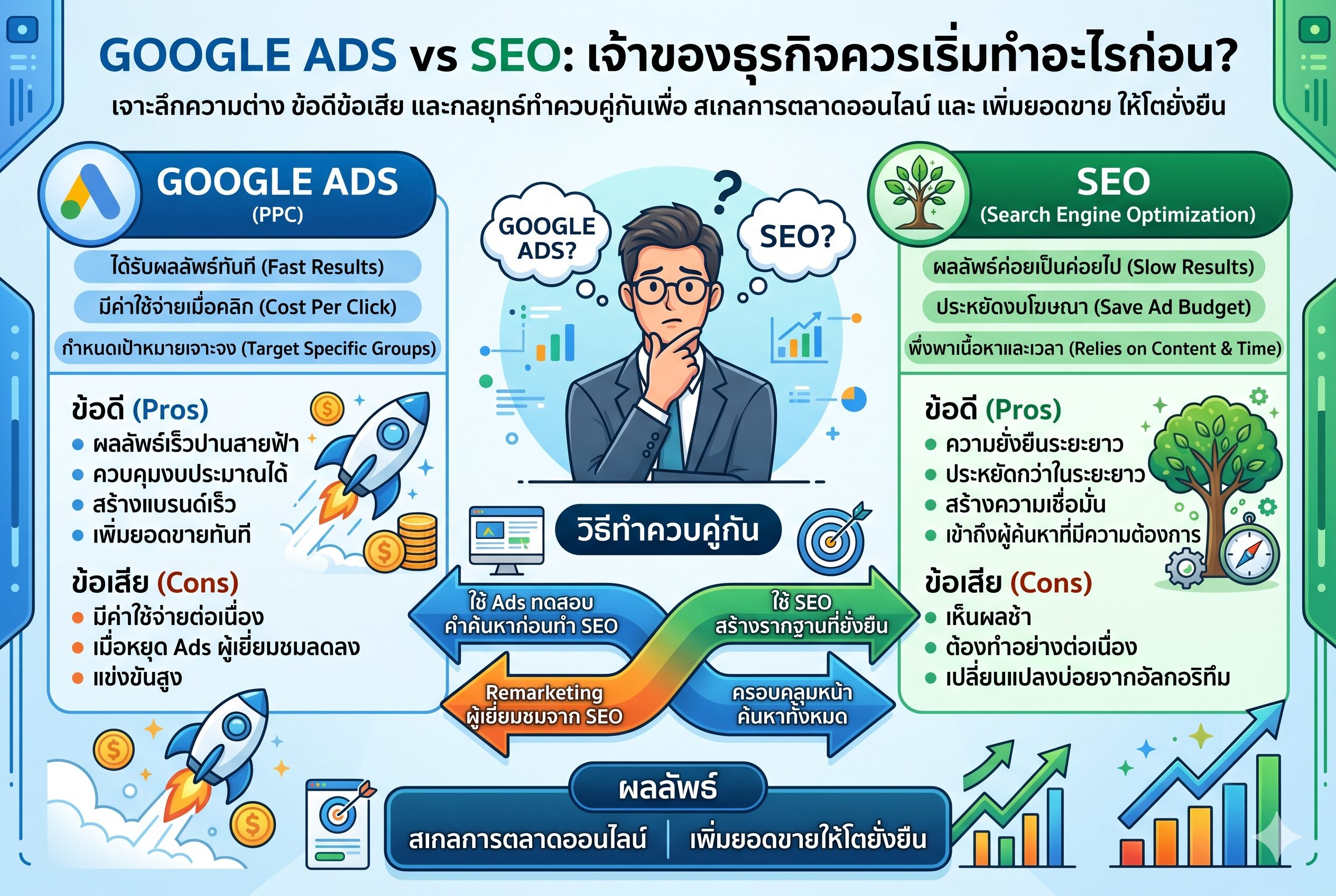 “ถ้ามีงบประมาณก้อนแรกก้อนเดียว ควรเอาไปทุ่มยิงแอดให้ได้ยอดขายไวๆ เพื่อหมุนเงินก่อนดีไหม? หรือควรจะยอมเหนื่อยจ้างทำเว็บไซต์ปั้นบทความเพื่อกินระยะยาวดีกว่ากัน? เลือกทำแบบไหนถึงจะคุ้มค่าเงินและปลอดภัยกับธุรกิจที่สุด?”