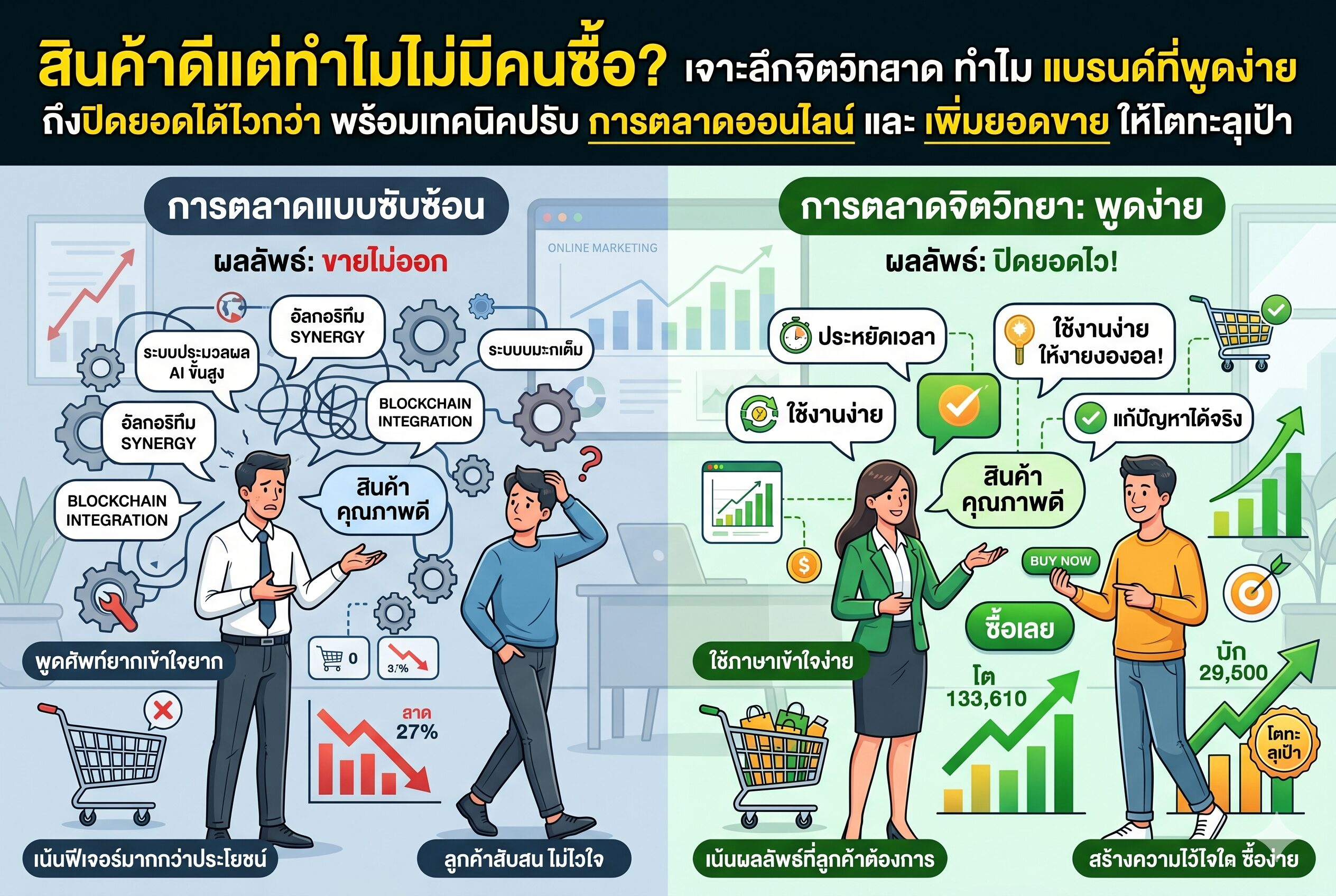 กฎเหล็กของการทำ การตลาดออนไลน์ ในยุคนี้คือ “ลูกค้าไม่ได้ซื้อของที่ดีที่สุด แต่เขาซื้อของที่เข้าใจง่ายที่สุด” ต่างหากครับ! วันนี้ผู้เชี่ยวชาญจาก DigitalD2M จะพาคุณมาถอดรหัสจิตวิทยาผู้บริโภค เราจะมาเจาะลึกกันว่าทำไม แบรนด์ที่พูดง่าย ถึงเอาชนะใจลูกค้าและกวาดเงินในตลาดไปได้ทั้งหมด? และเราจะต้องปรับ การสื่อสารแบรนด์ อย่างไรเพื่อ เพิ่มยอดขาย แบบไม่ต้องเหนื่อยอธิบายยาวๆ? ไปเจาะลึกพร้อมกันเลยครับ!